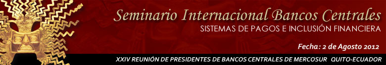Al conmemorar los 85 años de fundación, el Banco Central del Ecuador (BCE) organiza el Seminario Internacional “Bancos Centrales: Sistemas de Pagos e Inclusión Financiera” con el apoyo de la Alianza para la Inclusión Financiera (AFI), a realizarse en la ciudad de Quito (Swissotel), el 2 de Agosto de 2012, en el contexto de la XXIV Reunión de Presidentes de Bancos Centrales de Mercosur. |