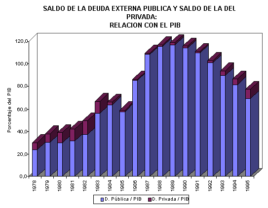 El saldo de la Deuda Externa Pública como porcentaje del PIB pasó de 100.9% en 1992 a 81.5% en 1994 y a 68.8% en 1995. Igualmente hay una reducción de los intereses devengados de la deuda externa pública con respecto a su saldo, que pasa de 6.6% en 1992 a 5.7% en 1995. También se observa un cambio con respecto a su estructura: en 1992 estos intereses hacia la banca privada representaban el 6.3% y hacia gobiernos 6.8%, mientras en 1995 los intereses devengados con la banca se reducen considerablemente, a un 3.8%, mientras que con gobiernos se incrementa a un 7.3%.