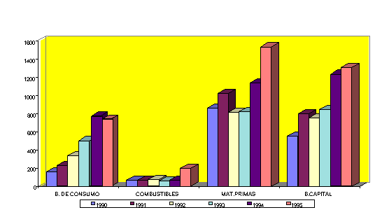 Las importaciones alcanzaron un valor de US$ 4.095 millones, creciendo al 24.8% respecto al año anterior. Si se excluye las importaciones extraordinarias, la tasa de crecimiento asciende a 18%, lo cual es compatible con las tendencias de mediano plazo. Adicionalmente, se revirtió la tendencia de los dos años anteriores en cuanto a su composición, pues el boom de importaciones de bienes de consumo, asociado a los efectos iniciales del proceso de apertura, se moduló significativamente, apreciándose un crecimiento mayor de la importación de bienes de capital y materias primas.