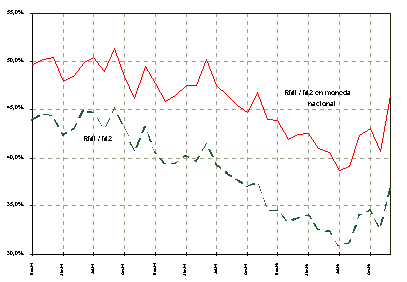 De su lado, la relación entre la RMI y la liquidez bancaria (M2), cercana a 44.9% en diciembre de 1995, decreció al 36.7% a finales de 1996, como consecuencia de la venta de divisas al sector privado por parte del BCE, combinada con una expansión del crédito interno neto del Instituto Emisor. Sin embargo, hay que señalar que esta relación registró un incremento en el último mes de este año. Las cuentas en moneda extranjera están a la cotización oficial de venta, vigente para fin de cada mes. | |