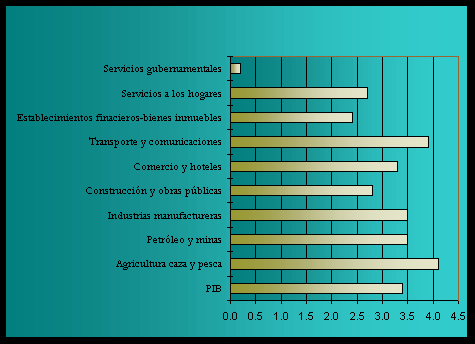 A nivel de sectores, la tendencias económicas señaladas estuvieron determinadas en especial por los subsectores "agricultura, caza y pesca" (3.4%), "petróleo y minas" (3.5%), "industria manufacturera" (3.5%), "construcción y obras públicas" (2.8%) y, "transporte y comunicaciones" (3.9%).