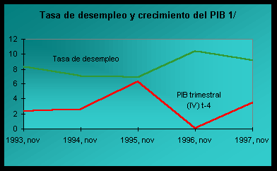 La reactivación del año 1997 se apreció también en el mercado de trabajo. La tasa de desempleo experimentó una ligera disminución al pasar de 10.4% en 1996 a 9.2% en 1997, al igual que la de subempleo, que varió de 43.4% a 40.4% en los mismos años.