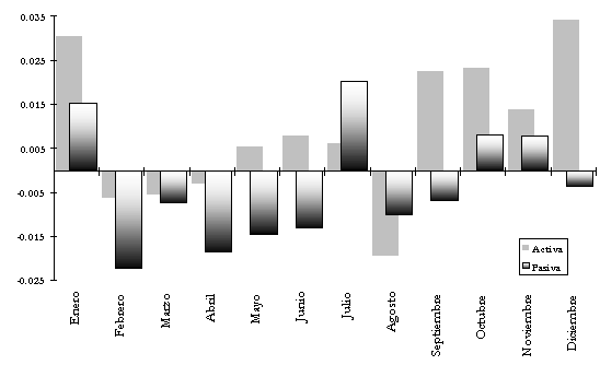 A lo largo de 1997, la pendiente se mantuvo en valores inferiores a los observados en anteriores años, registrándose incluso episodios de pendiente negativa en 8 y 4 de los meses para las tasas pasivas y activas, respectivamente. Las expectativas de disminución de la tasa de interés son un claro indicativo de la credibilidad de los agentes en el esquema monetario y cambiario, así como en la autoridad que lo regía.