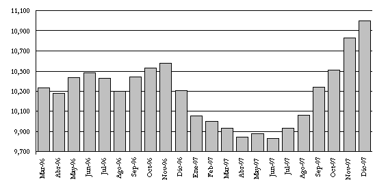 El efecto del incremento del encaje sobre el multiplicador de la base se dejó sentir en M1 con una tasa de crecimiento de finales de año dos puntos menor a su similar de enero/97. El agregado más amplio M2 es el más sensible a la tendencia de la creación primaria y secundaria del dinero, de allí que su tasa de crecimiento haya coincidido con la tasa de crecimiento de los precios a finales de año y con la meta de inflación programada para este año.