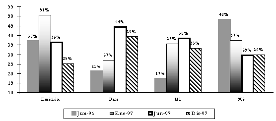 El control de la autoridad sobre los agregados a través de las operaciones de mercado abierto busca coherencia entre su crecimiento y el objetivo de estabilidad de precios. Para el año 1997, el crecimiento anual de la emisión disminuyó paulatinamente del atípico 51% registrado en enero a un 25% a finales de año. En cuanto a la base monetaria y a M1, ambos presentan tasas de crecimiento mayores a mitad del año que de ninguna manera pueden asociarse a una política monetaria expansiva. En el caso de la base monetaria, el incremento del requerimiento de encaje implementado a partir de la regulación 1000, de marzo 26, resultó en la tasa de crecimiento antes anotada; no obstante, para finales de año la evolución de ese agregado muestra un claro cambio de tendencia, terminando con una tasa de incremento anual de 39%.