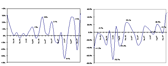 En el Ecuador se observa un crecimiento anticipado de cartera frente a una expansión en el nivel de actividad económica (obsérvese 1994). No obstante, durante 1997 no se repite este comportamiento, pues cuando la producción real reinicia una expansión (segundo y tercer trimestres) la cartera registra todavía crecimientos reales negativos, lo que muestra en cierta forma un manejo más prudente de los activos por parte de la banca.