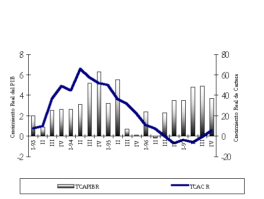 Otro elemento importante que permite evaluar la vulnerabilidad del sistema bancario en un período dado es el crecimiento de su cartera, el cual está asociado al desenvolvimiento de la actividad económica. Son varios los estudios que señalan que la fragilidad del sistema financiero aumenta tras períodos de auge económico, ya que se generan expansiones exageradas de cartera que en el futuro determinan problemas de morosidad. Esta expansión de cartera se produce ya que, ante las percepciones de una reactivación económica, los prestatarios aumentan su demanda de crédito por expectativas de un mayor nivel de ingreso futuro y los bancos se unen a este optimismo que genera una elevada oferta de crédito. Sin embargo, este comportamiento trae como consecuencia una mayor exposición al riesgo de cartera al intensificarse los problemas de selección adversa y riesgo moral. Finalmente, cuando el ciclo económico inicia su contracción, las empresas disminuyen su capacidad de pago debido a problemas de demanda y rentabilidad. Ello introduce más vulnerabilidad en el sistema financiero.
