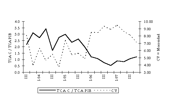 Partiendo de este análisis y para sistematizar la correspondencia entre la actividad económica, cartera y vulnerabilidad del sistema, se utiliza la relación entre los índices tasa de crecimiento de cartera sobre el crecimiento del PIB (TCA C/TCA PIB) y morosidad del sistema (cartera vencida/cartera total). Niveles del índice (TCA C/TCA PIB) mayores que uno significan que el crédito se está expandiendo mas allá de lo que se expande el PIB, manifestándose lo que podría iniciar un boom de cartera. Como se aprecia en el siguiente gráfico, previo a los problemas de liquidez que enfrentó el sistema financiero a fines de 1995, se observó una expansión de cartera que llevó a este índice a niveles elevados (entre 2 y 3.5). Posteriormente, durante 1996, se evidenciaron relaciones de cartera vencida/cartera total superiores al 9% durante 1996. Para 1997, como resultado de la conducción monetaria, el comportamiento descrito revirtió su tendencia de manera tal que el índice de crecimiento de cartera se ubicó en niveles de alrededor de 1; con ello vino casi de manera inmediata un descenso de la cartera vencida, reflejándose así las mejores condiciones del sistema financiero en dicho período, que en términos generales se pueden calificar como menos vulnerables que en el año inmediatamente anterior.