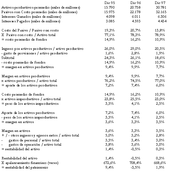 Al aplicar el análisis de rentabilidad Du Pont a diciembre de 1997 se aprecia una recuperación del margen en activos promedio del sistema bancario, pues este se ubica en 3.5%, en tanto que para diciembre de 1996 alcanzó un 3.3%, a pesar de la reducción de las tasas activa y pasiva promedio. Dicha recuperación se debe básicamente a un mejoramiento en la calidad de los activos, reflejado en una disminución de la cartera vencida que de 9.4% se ubicó en 7.3% de la cartera total. Esto generó una reducción en el gasto de provisiones y un mejoramiento en la participación de los activos productivos, que pasaron de 74.5% en diciembre de 1996 a 77.0% a fines del año anterior. Por otro lado, se aprecia un esfuerzo de la banca por reducir los gastos administrativos (personal y operación) que bajaron en un punto porcentual en comparación con el activo total durante 1997; esto permitió mejorar la rentabilidad del activo en relación al año anterior que de -0.5% se ubicó en 0.3%.