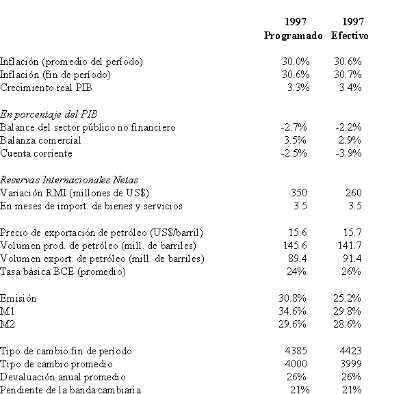 En suma, a lo largo de 1997 la autoridad monetaria, aplicando una política conservadora, en base a una evaluación permanente de la coyuntura, logró neutralizar las fuertes tensiones de inestabilidad que derivaron sobre todo de la crisis política de principios de año.