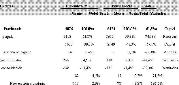 Si bien se observa que todos los bancos cumplen con el requerimiento de patrimonio técnico y que este ha mejorado durante 1997, hay que destacar que la estructura patrimonial de los bancos está influenciada por Banco Continental pues al excluirlo se aprecia que el crecimiento del capital pagado fue de 38.5%, frente al 74.7% que se observa al incluirlo. Si bien este crecimiento es importante no hay que olvidar que aún algunos bancos están inmersos en el cronograma de aproximación de capital para adecuarse a las normas vigentes.