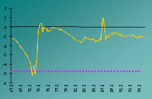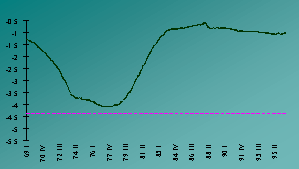 D LPIBt-1) son los N rezagos del producto interno bruto necesarios para que el residuo (u t) sea ruido blanco. Dt es una variable binaria que toma los valores de uno para todo t > T0 (período de quiebre) y ceros para todo t £ T0. De la misma manera, DTt vale cero para t £ T0 y es igual a (t - T0 ) para t > T0.El test de Zivot y Andrews se aplicó recursivamente, es decir, para todos los T0 posibles. Al permitir que los quiebres se calculen endógenamente, se reduce la posibilidad de no rechazar la hipótesis nula cuando ésta no es verdadera, por lo que las conclusiones son mucho más sólidas.
