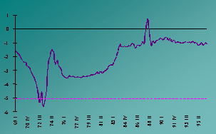 Se encontró además que la tasa estable de crecimiento anual es de 4.35%. Esta tasa es un indicador de cuanto crecería la economía en ausencia de shocks exógenos, proporcionando la tendencia de largo plazo en condiciones de completa estabilidad. De este resultado se puede inferir que factores exógenos han incidido substancialmente en el crecimiento económico ecuatoriano. Es así que, si se consideran únicamente las dos últimas décadas, cuando el Ecuador debió enfrentar una serie de shocks negativos, se observa que la tasa de crecimiento promedio de la economía ha sido tan sólo de 2.6%, mientras que en condiciones de completa estabilidad hubiera crecido por lo menos alrededor del 4.35%. Por tanto, esa brecha sería causada por la presencia de los factores estocásticos reales.