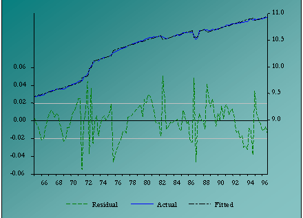 donde el logaritmo del producto interno bruto real (LPIB) sigue un proceso autoregresivo de primer orden y (DLPIB)t-1 son las N primeras diferencias necesarias para que el residuo (ut) sea "ruido blanco".