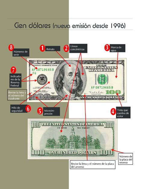 palabras “USA100” impresas en el hilo son visibles al trasluz, en ambas caras